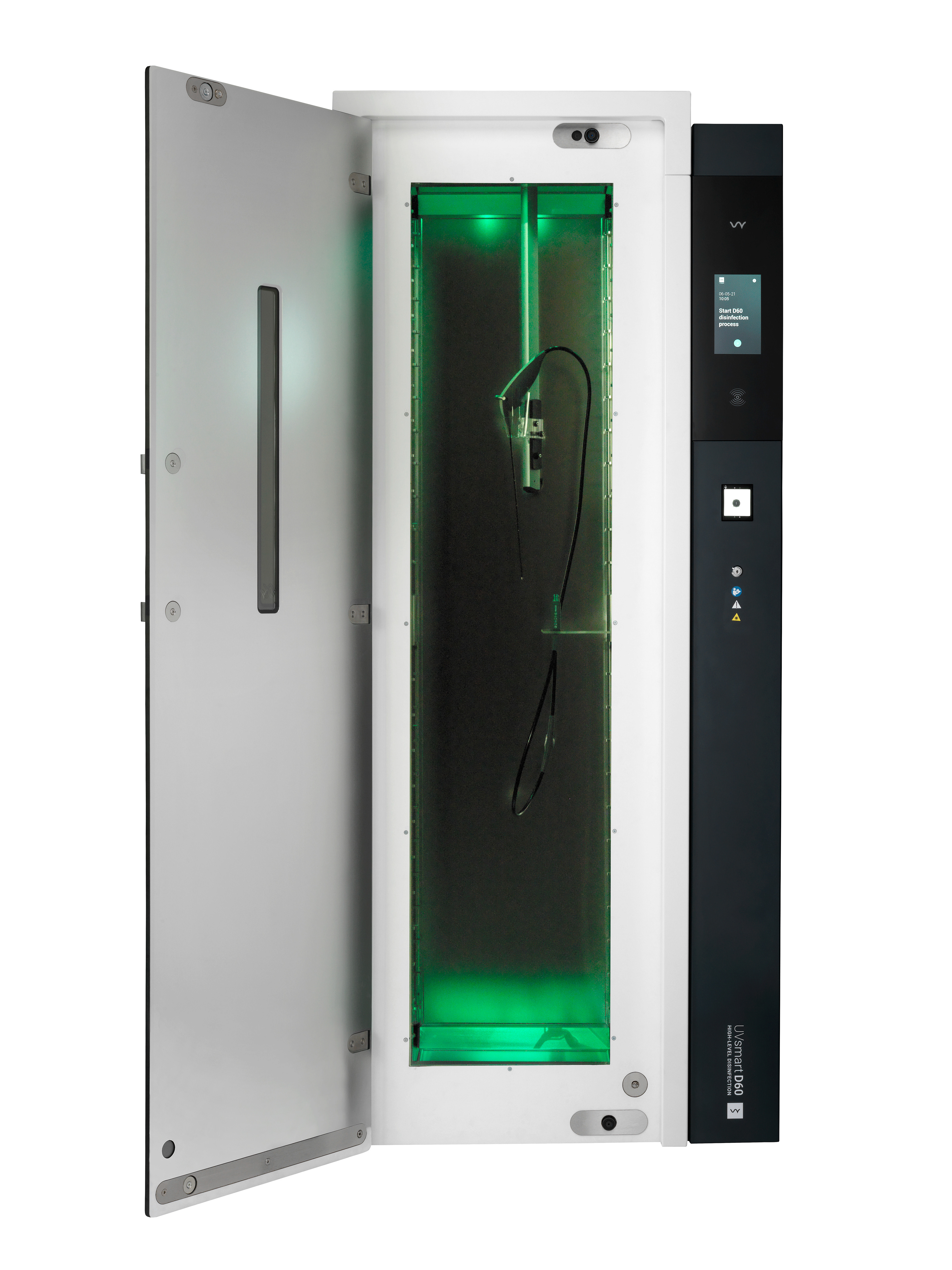 The D60 can perform high-level disinfection of user's items in 60 seconds. Users do not need any liquids, wipes or high-energy consuming disinfectants. Instead, only a regular power socket is required. Insert your item inside the D60, disinfect your hands and take-out your item when the door of the D60 has opened automatically after 60 seconds.